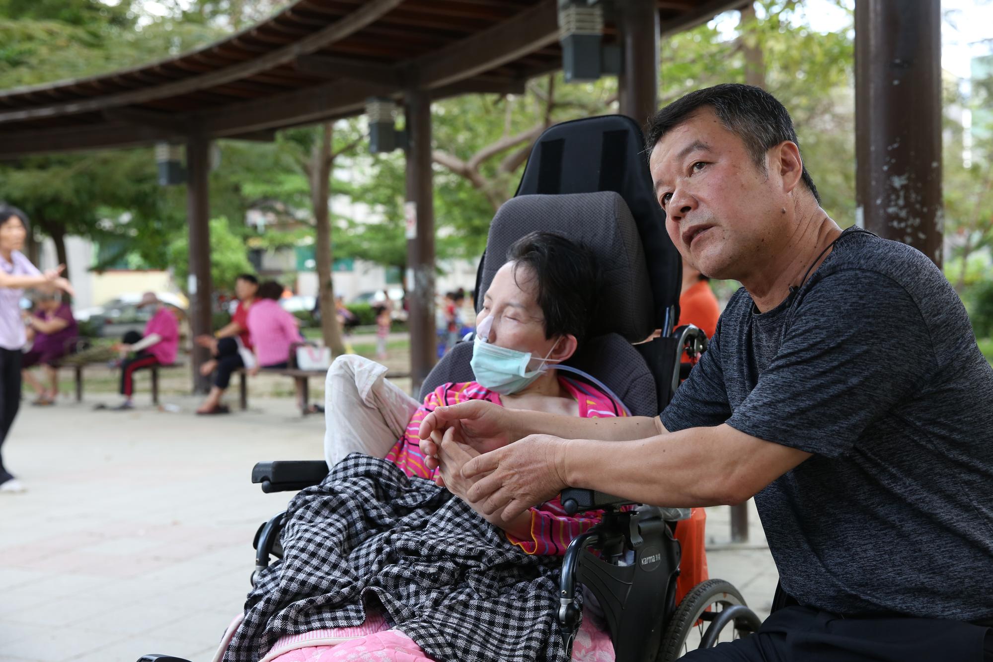 傍晚的南台灣,高博勇陪躺在輪椅上的太太張世芬在公園乘涼。他們也是高雄米格手作義式霜淇淋老闆兄弟高名岳、高名志的父母,高名岳的小腦症即遺傳自媽媽張世芬。