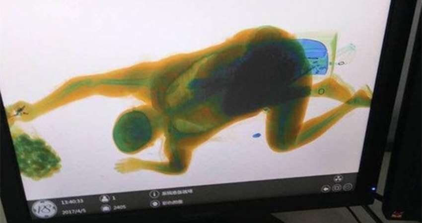 後來才知道,這個大叔在通過安檢門時因覺得自己的包包沒有放好,想要扶一下,沒想到一個沒站穩居然跌到機器上,被傳輸帶直接送進機器裡,才讓安檢機的螢幕上出現這驚人的一幕,讓現場眾人好氣又好笑!